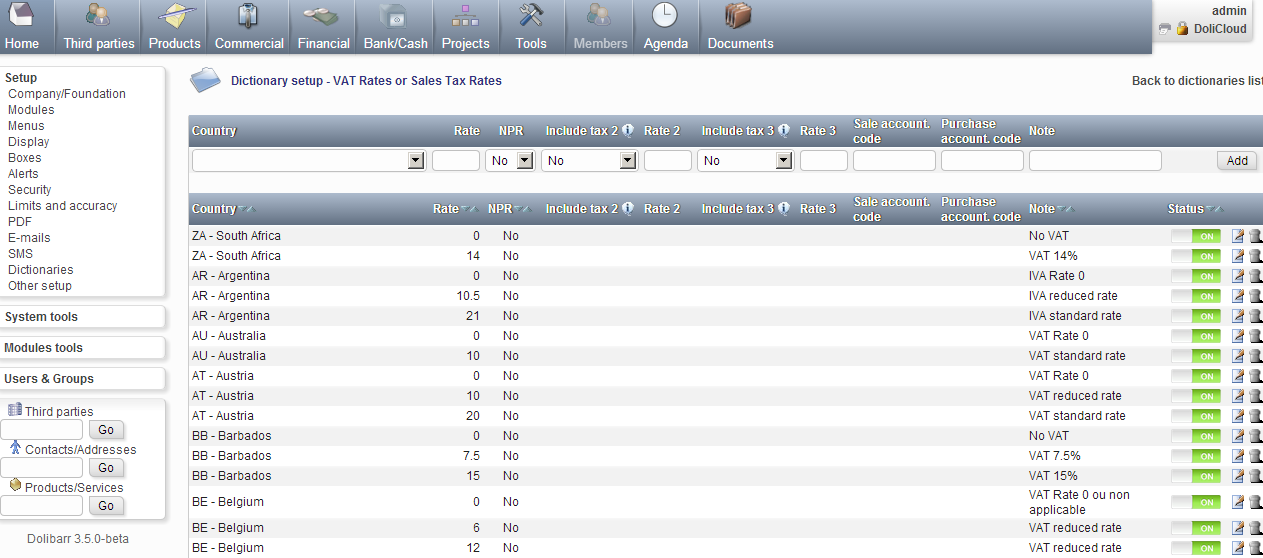 Este tutorial le describirá cómo cambiar o agregar una tasa de IVA para un país específico, en cualquier software alojado por DoliCloud. Todo el software OpenSource alojado por DoliCloud se explica si el IVA es un dato gestionado por software. Vaya al capítulo que coincida con su software y versión.