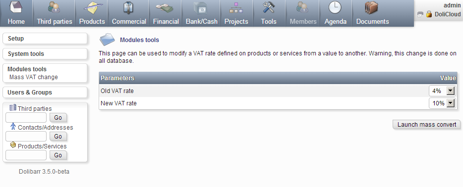 Si el módulo Producto o Servicio está habilitado y desea cambiar la tasa de IVA (que se ha definido ) como la tarifa a utilizar para algunos productos predefinidos. - Navega al menú Inicio - Herramientas de módulos - Elija la entrada de menú Cambio de IVA masivo. - Obtendrás una página con dos líneas: