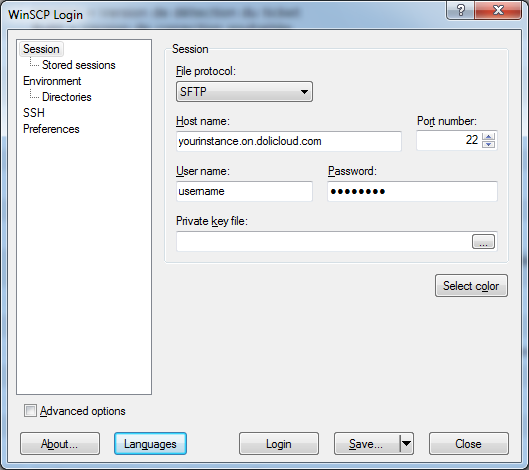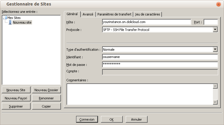 DoliCloud est une solution d'hébergement ouverte. Cela signifie que vous pouvez voir, modifier et télécharger vos fichiers programmes ou de données hébergées. Une des interface possible pour cela est le Secure FTP (SFTP). SFTP est un protocol simple et sécurisé pour accéder à votre instance. WinSCP et FileZilla sont des clients très populaires pour Windows. Mais tout client SFTP, avec tout OS fait très bien l'affaire. Cette page décrit comment configurer votre accès SFTP. Récupérer vos identifiants SFTP- Aller dans votre espace client https://myaccount.dolicloud.com/ - Cliquer sur le menu "Mes applications & Options". - Relever les identifiants SFTP visibles en cliquant sur l'onglet "SSH /SFTP". Vous trouverez le nom du serveur, utilisateur et mot de passe (Remarque: ces identifiants ne sont visibles qu'après avoir souscrit à une formule payante et avoir saisi vos identifiants bancaires). - L'étape suivante est de configurer votre client SFTP avec ces identifiants... Configuration la connexion SFTP avec FileZillaPour les utilisateurs Windows utilisant FileZilla. - Lancer FileZilla - Cliquer sur Fichier - Gestionnaire de sites - Cliquer sur Nouveau site - Selectionner le protocol "SFTP" et reporter le nom du serveur et vos identifiants (trouvés au premier chapitre) tel que visible sur cette copie d'écran (laisser le champ "Port" vide).